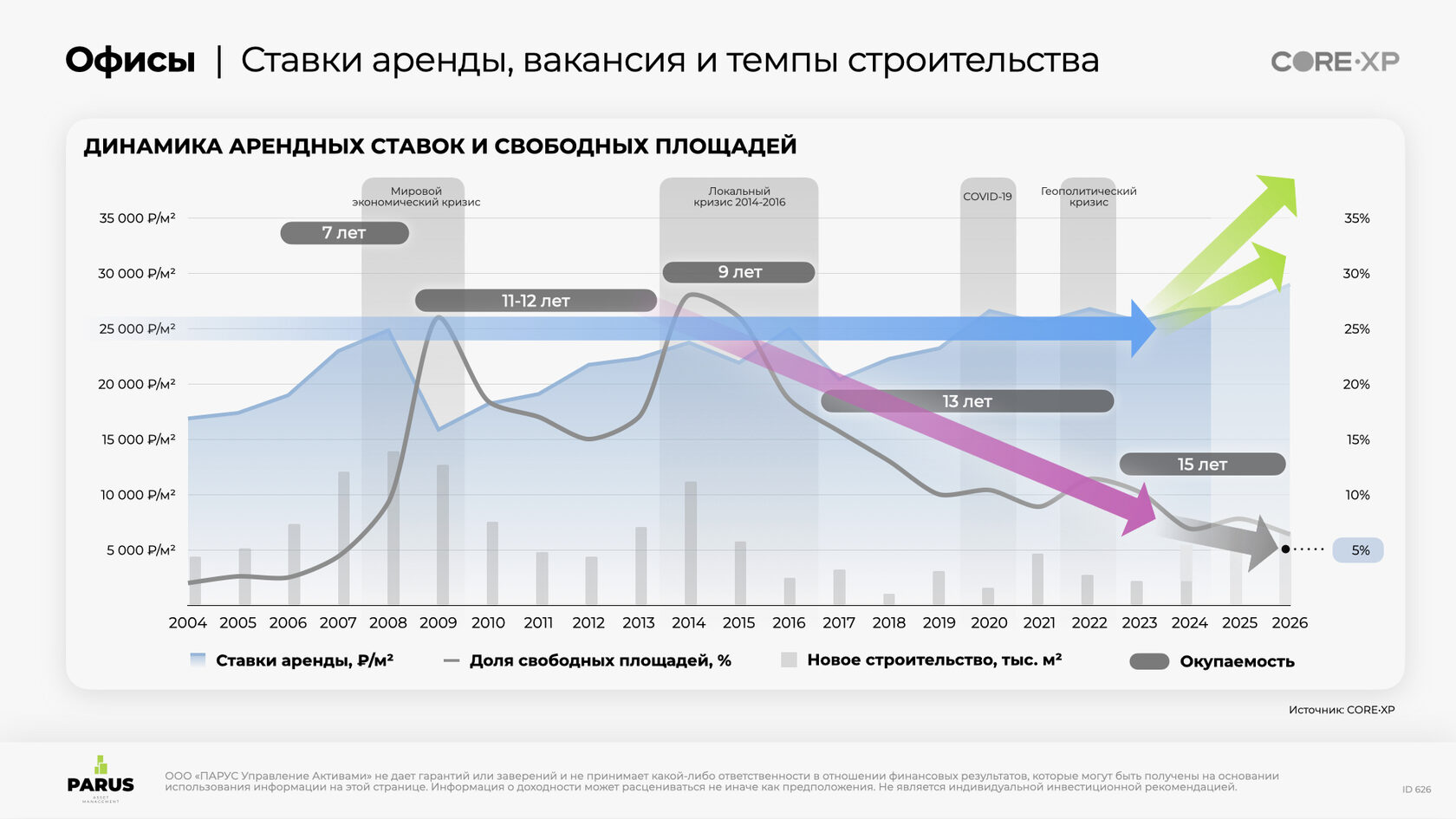 С 2009 года ставка аренды на офисный сегмент коммерческой недвижимости держалась на уровне 25 000 ₽/кв. м. Однако снижение объема строительства в 2014 г. привело к постепенному уменьшению вакансии на рынке до 10% к 2023 году.
